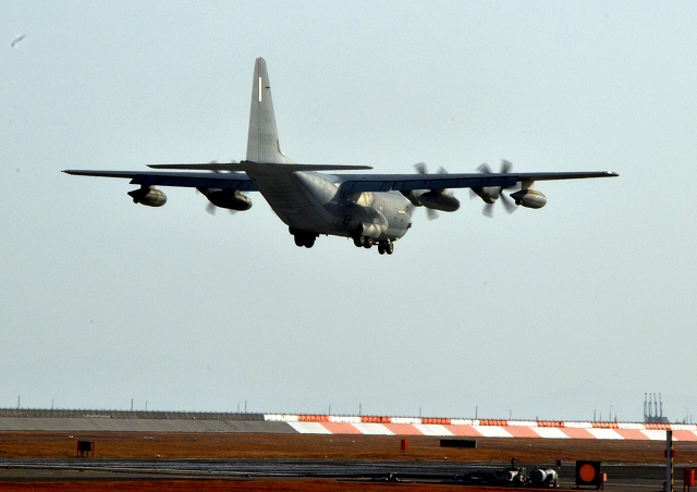 米海兵隊 KC-130J 空中給油機 スーパーハーキュリーズ(岩国基地)、8065番機が着陸 |