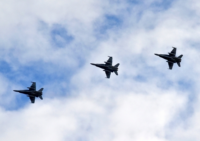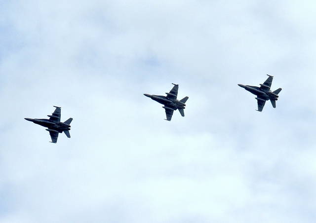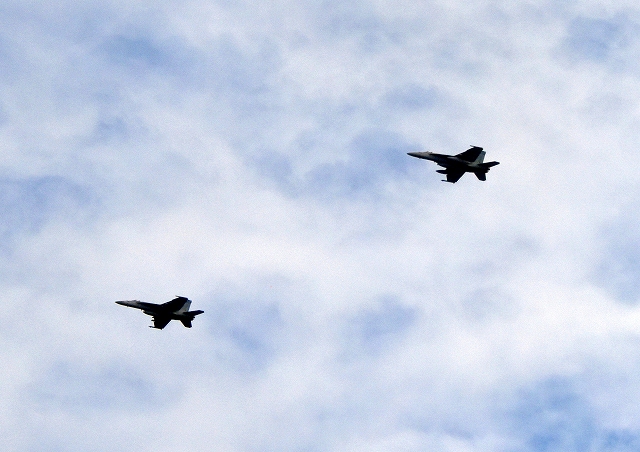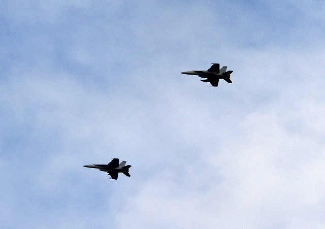 米海軍艦載機 F/A-18E スーパーホーネット 戦闘攻撃機(岩国基地)、NF、411番機、412番機が2機編隊で帰還 |