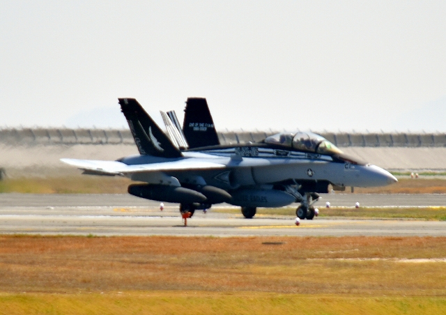 米海兵隊 F/A-18D ホーネット 戦闘攻撃機(岩国基地)、VE、21番機が飛来、着陸 |