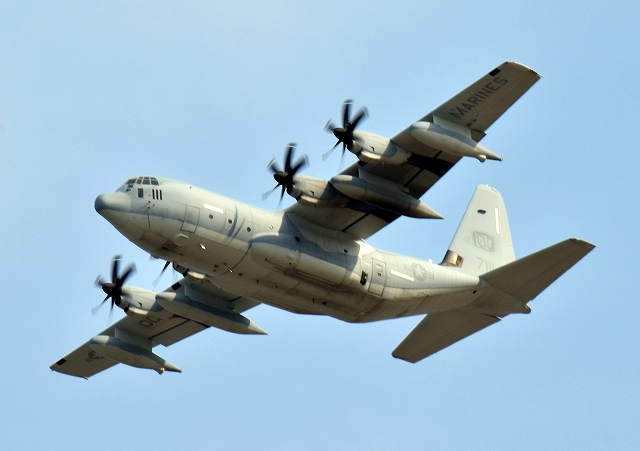 米海兵隊 KC-130J 空中給油機 スーパーハーキュリーズ(岩国基地)、7111番機が旋回(3周目) |