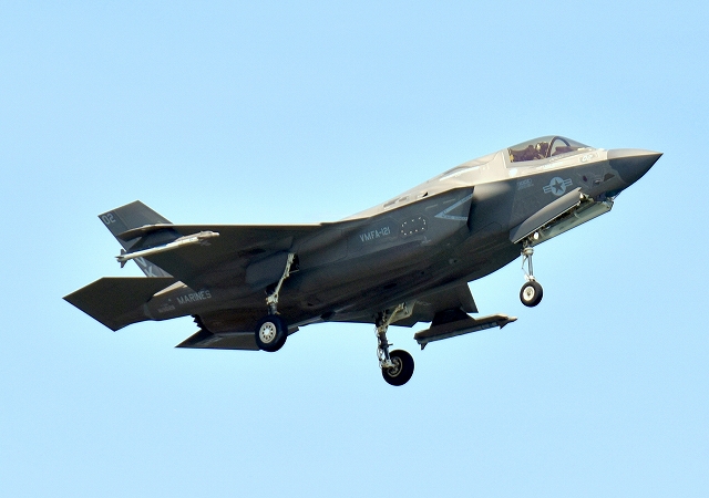 米海兵隊 F-35B ライトニングⅡ 戦闘機(岩国基地)、VK、02番機が着陸 |