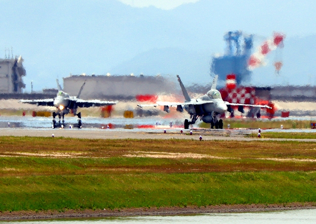 米海兵隊 F/A-18D/C ホーネット 戦闘攻撃機(岩国基地)、VE、20番機、04番機が帰還、着陸 |