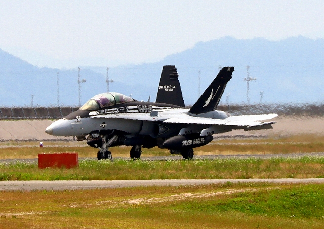 米海兵隊 F/A-18C ホーネット 戦闘攻撃機(岩国基地)、VE、02番機が着陸 |