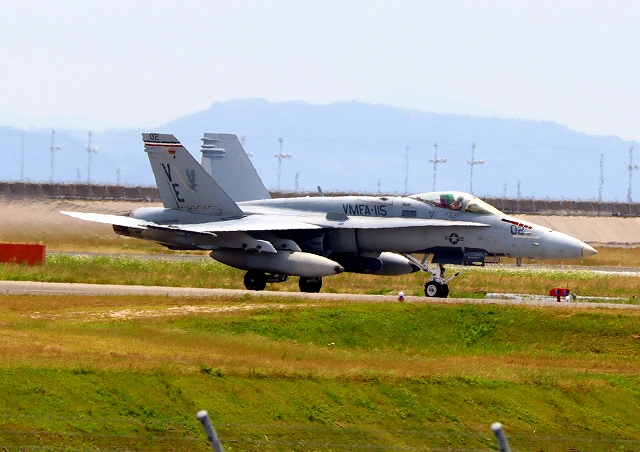 米海兵隊 F/A-18D ホーネット 戦闘攻撃機(岩国基地)、VE、21番機が着陸 |