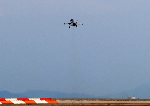 米海兵隊 F-35B ライトニングⅡ 戦闘攻撃機(岩国基地)、?番機が帰還、新しい垂直着陸パッドの上でホバリング |