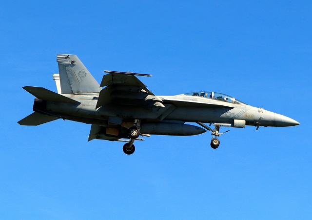 米海軍艦載機 F/A-18F スーパーホーネット 戦闘攻撃機(岩国基地)、NF、114番機が着陸 |