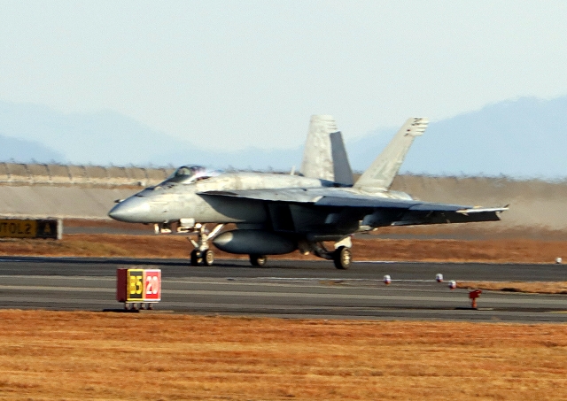 米海軍艦載機 F/A-18E スーパーホーネット 戦闘攻撃機(岩国基地)、NF212番機が着陸 14時05分に離陸した機。1時間28分の飛行でした。 |