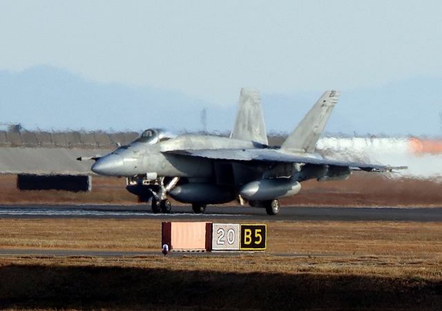 米海軍艦載機 F/A-18E スーパーホーネット 戦闘攻撃機(岩国基地)、NF202番機が着陸 14時07分に離陸した機。1時間06分の飛行でした。 |