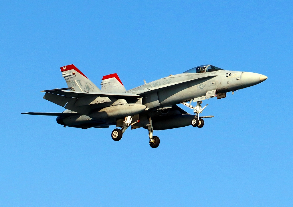 米海兵隊 F/A-18C ホーネット 戦闘攻撃機(岩国基地)、WT、04番機が着陸