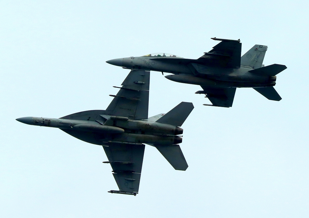 米海軍艦載機 F/A-18F スーパーホーネット 戦闘攻撃機(岩国基地)、NF、114番機、113番機が2機編隊で帰還