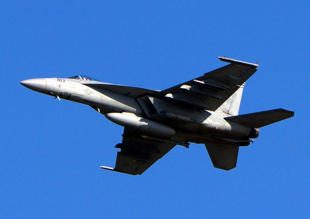米海軍艦載機 F/A-18E スーパーホーネット 戦闘攻撃機(岩国基地)、NF、303番機が離陸