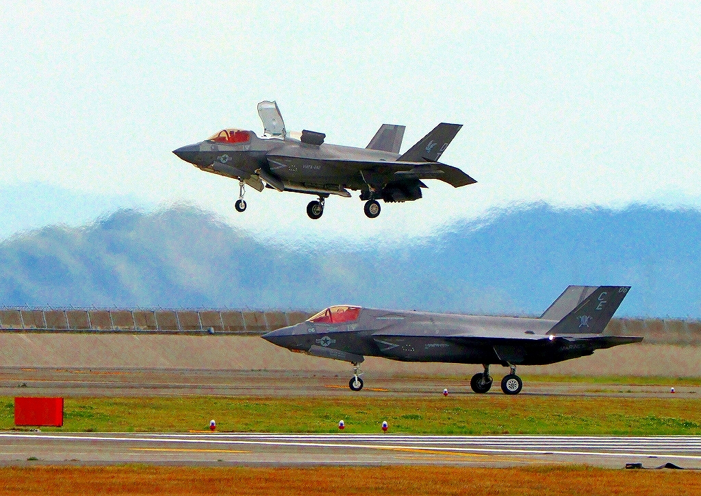 2024年4月9日(火)米海兵隊 F-35B ライトニングⅡ 戦闘機(岩国基地)、DT、11番機が垂直着陸パッドの上でホバリング。前に米海兵隊 F-35B ライトニングⅡ 戦闘機(米本国海兵隊基地)、CE、06番機