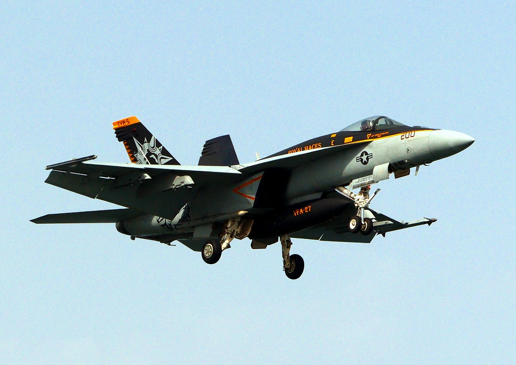 米海軍艦載機 F/A-18E スーパーホーネット 戦闘攻撃機(岩国基地)、NF、200番機が帰還、着陸。