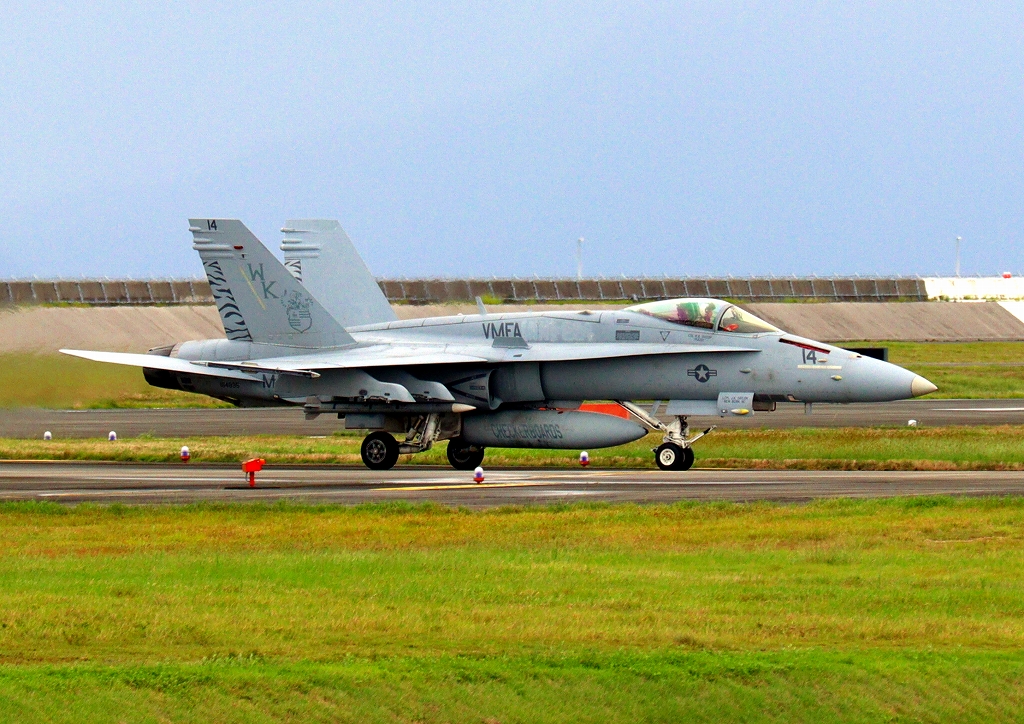 米海兵隊 F/A-18C ホーネット 戦闘攻撃機(岩国基地)、WK、14番機が着陸