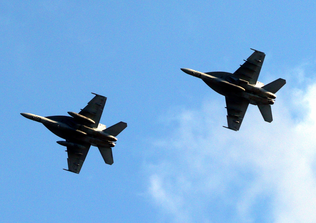 米海軍艦載機 F/A-18F スーパーホーネット 戦闘攻撃機(岩国基地)、NF、114番機、116番機が2機編隊で帰還