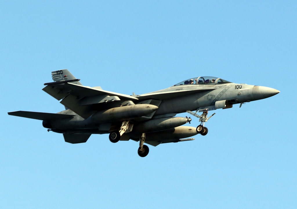 米海軍艦載機 F/A-18F スーパーホーネット 戦闘攻撃機(岩国基地)、NF、100番機が帰還、着陸