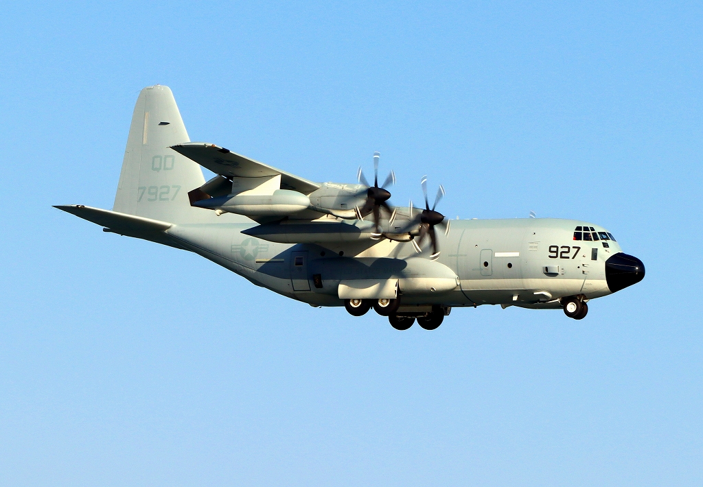 米海兵隊 KC-130J 空中給油機 スーパーハーキュリーズ(岩国基地)、7927番機が帰還、着陸