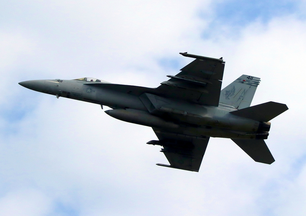 米海軍艦載機 F/A-18E スーパーホーネット 戦闘攻撃機(岩国基地)、NF、411番機が離陸