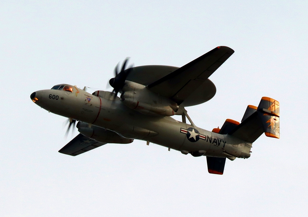 米海軍艦載機 E-2D アドヴァンスド・ホークアイ 早期警戒機(岩国基地)、600番機が離陸