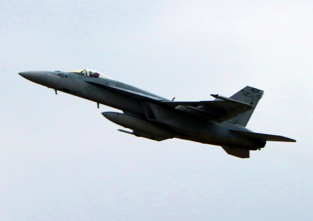 米海軍艦載機 F/A-18E スーパーホーネット 戦闘攻撃機(岩国基地)、NF、404番機が離陸
