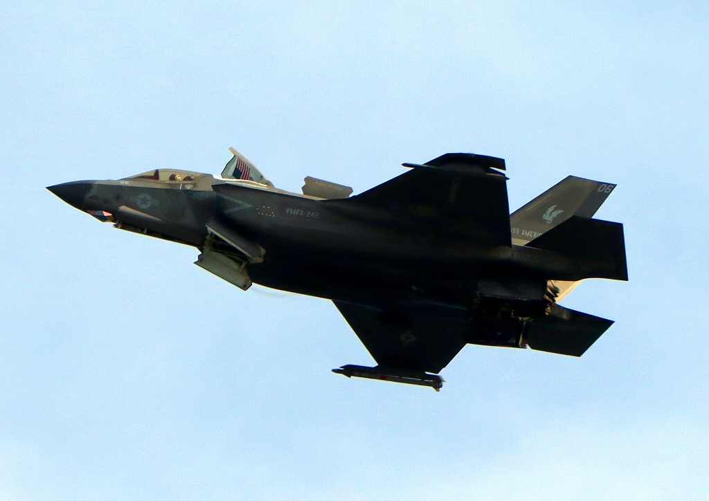 2024年2月7日(水)米海兵隊 F-35B ライトニングⅡ 戦闘機(岩国基地)、DT、06番機が短距離離陸。 F-35Bの操縦席後部のカバーは垂直上昇用のリフトファンを使用するときに開くということです。