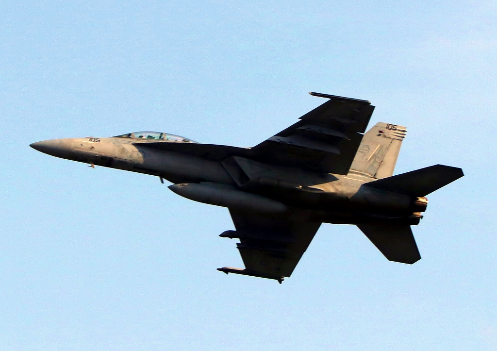 米海軍艦載機 F/A-18F スーパーホーネット 戦闘攻撃機(岩国基地)、NF、105番機が離陸