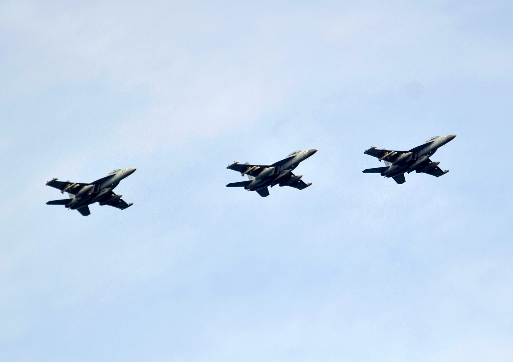 米海軍艦載機 EA-18G グラウラー 電子戦機(岩国基地)、NF、501番機、507番機、503番機が3機編隊で帰還
