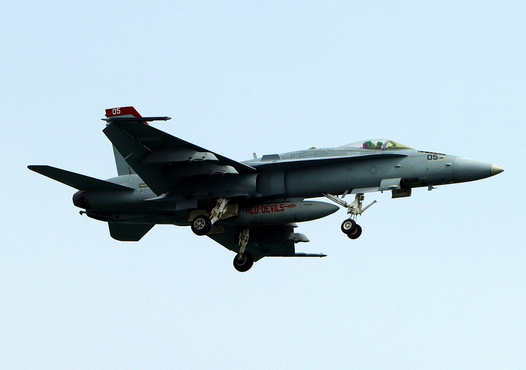 米海兵隊 F/A-18C ホーネット 戦闘攻撃機(岩国基地)、WT、05番機が帰還、着陸。