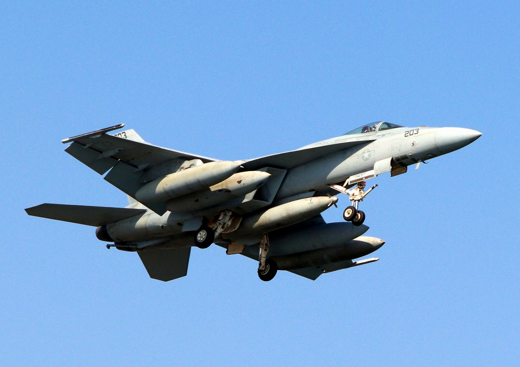 米海軍艦載機 F/A-18E スーパーホーネット 戦闘攻撃機(岩国基地)、NF、203番機が旋回(2周目)