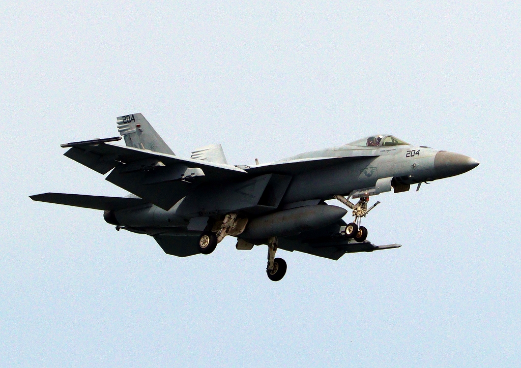 米海軍艦載機 F/A-18E スーパーホーネット 戦闘攻撃機(岩国基地)、NF、204番機が帰還、着陸