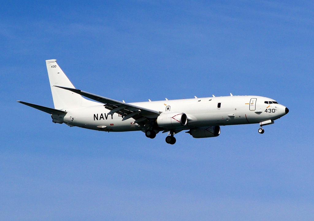 米海軍 P-8A 海上哨戒機 ポセイドン(嘉手納基地、三沢基地)、430番機が旋回