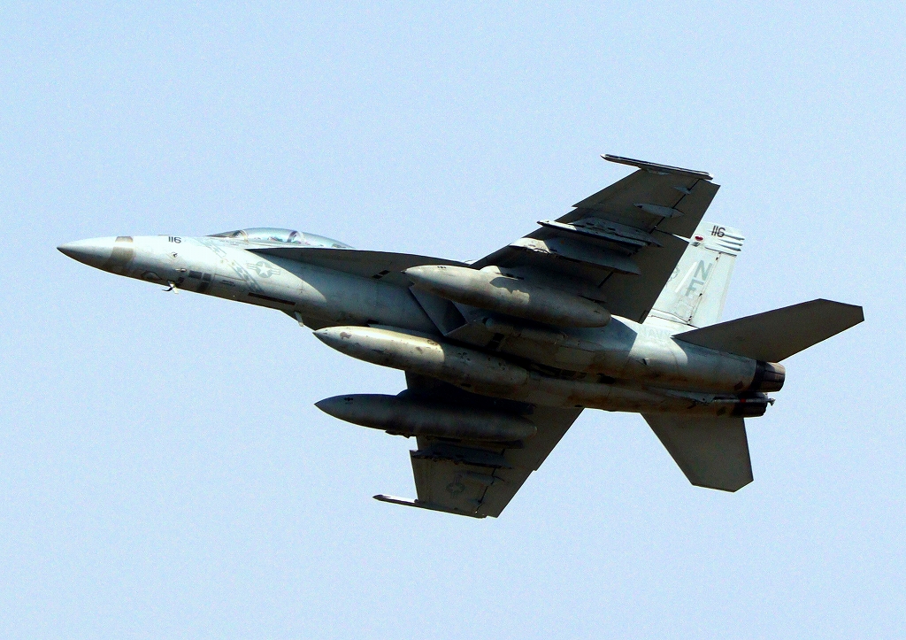 米海軍艦載機 F/A-18F スーパーホーネット 戦闘攻撃機(岩国基地)、NF、116番機が離陸