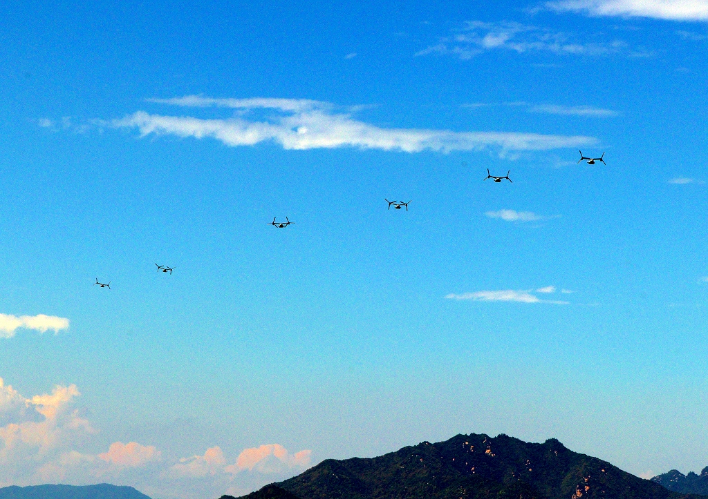 米海兵隊 MV-22B オスプレイ(普天間基地)、EP、09番機、10番機、14番機、06番機、01番機、04番機が6機編隊で飛来