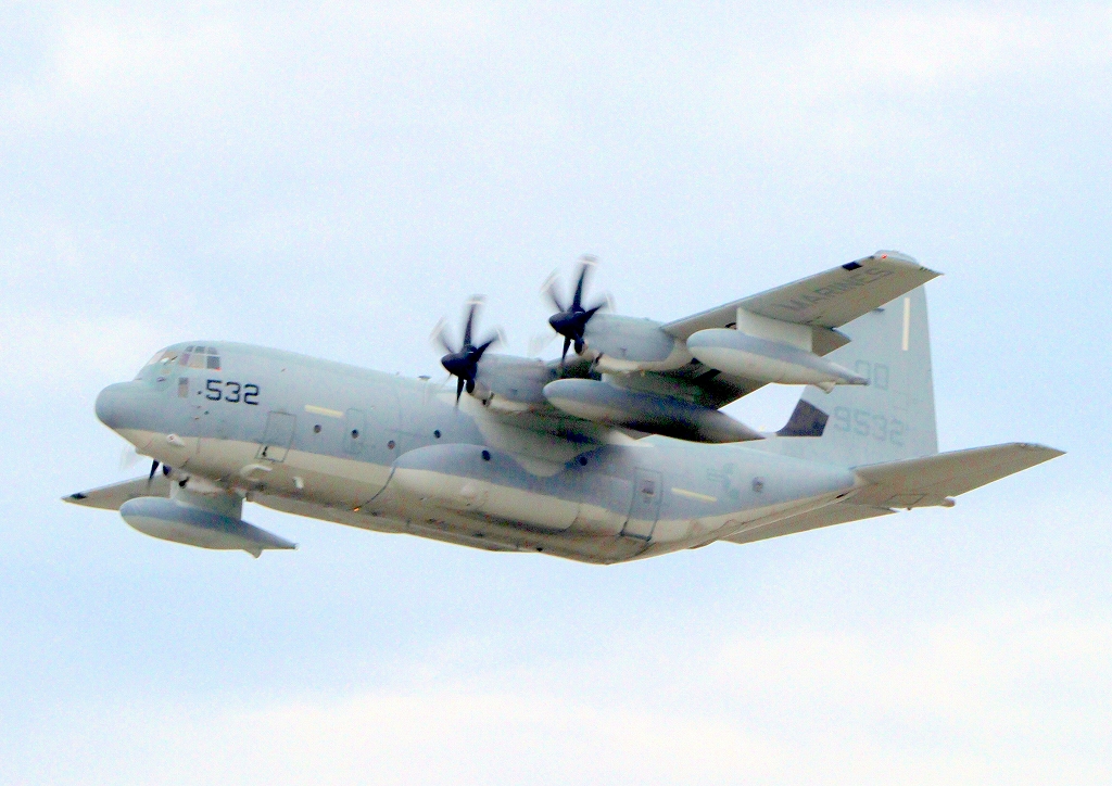 米海兵隊 KC-130J 空中給油機 スーパーハーキュリーズ(岩国基地)、QD 9532番機が離陸