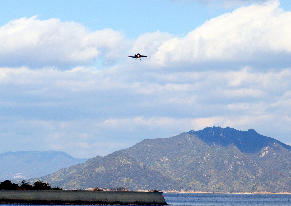 米海軍艦載機 F/A-18F スーパーホーネット 戦闘攻撃機(岩国基地)、NF、105番機は宮島、鷹の巣山の上を通って帰還