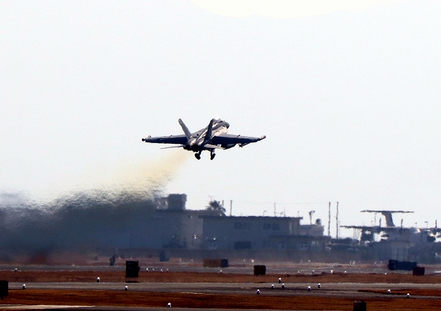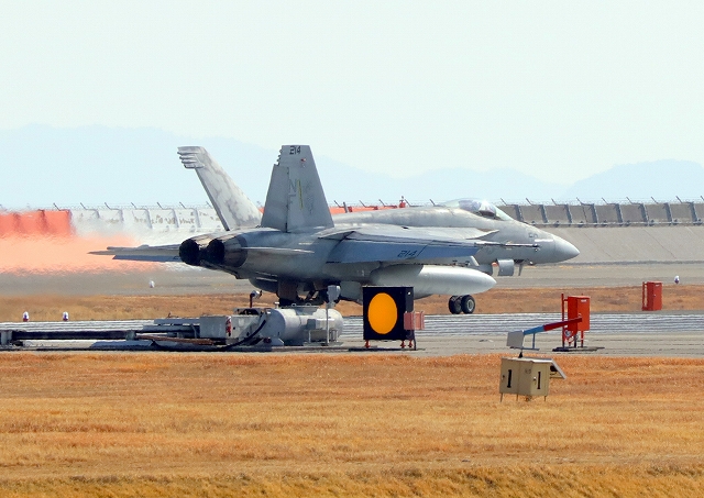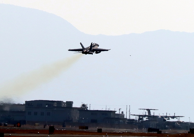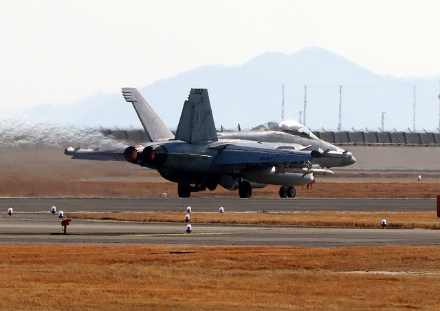 米海軍艦載機 F/A-18E スーパーホーネット 戦闘攻撃機(岩国基地)、NF、214番機が離陸 |