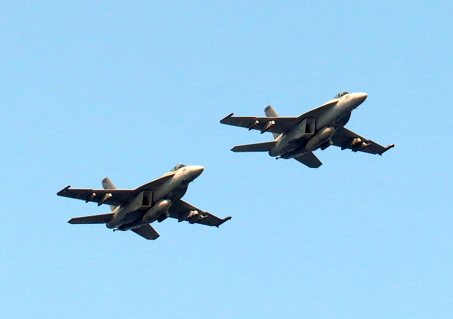 米海軍艦載機 F/A-18E スーパーホーネット 戦闘攻撃機(岩国基地)、NF、302番機、306番機が2機編隊で帰還 |