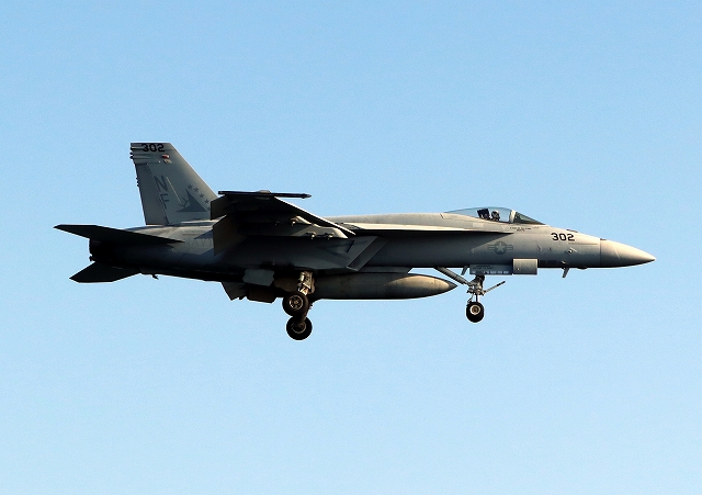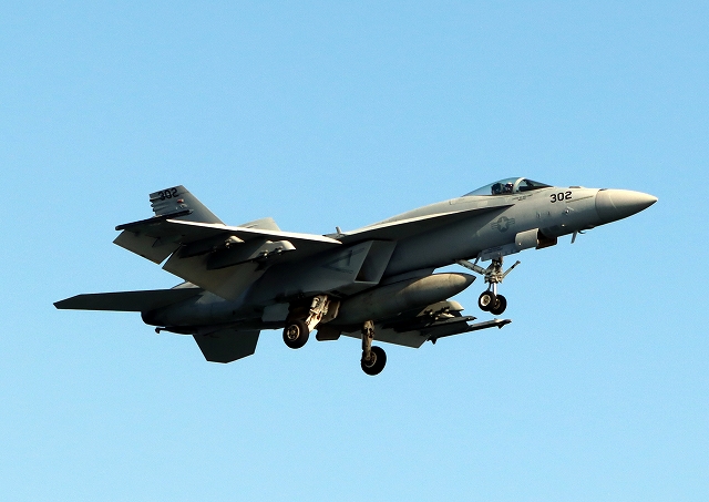 米海軍艦載機 F/A-18E スーパーホーネット 戦闘攻撃機(岩国基地)、NF、302番機が着陸 |