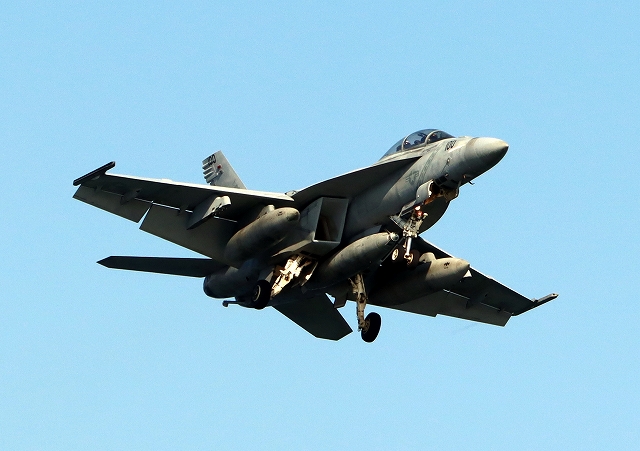 米海軍艦載機 F/A-18F スーパーホーネット 戦闘攻撃機(岩国基地)、NF、100番機が着陸 |