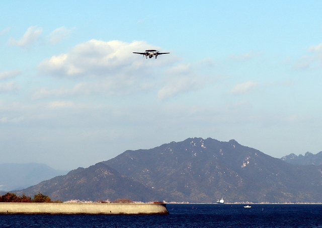 米海軍艦載機 E-2D アドヴァンスド・ホークアイ 早期警戒機(岩国基地)、601番機が旋回 |
