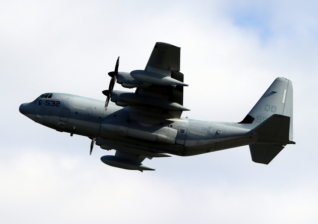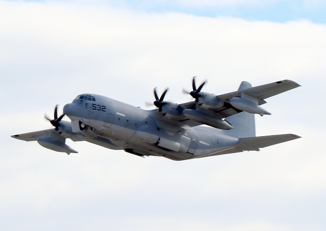 米海兵隊 KC-130J 空中給油機 スーパーハーキュリーズ(岩国基地)、9532番機が離陸 |