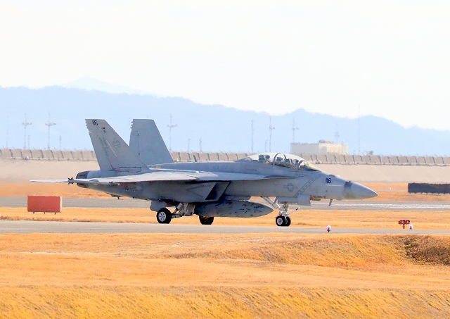 米海軍艦載機 F/A-18F スーパーホーネット 戦闘攻撃機(岩国基地)、NF、116番機が着陸 |