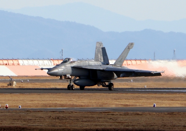 米海軍艦載機 F/A-18E スーパーホーネット 戦闘攻撃機(岩国基地)、NF、301番機が着陸