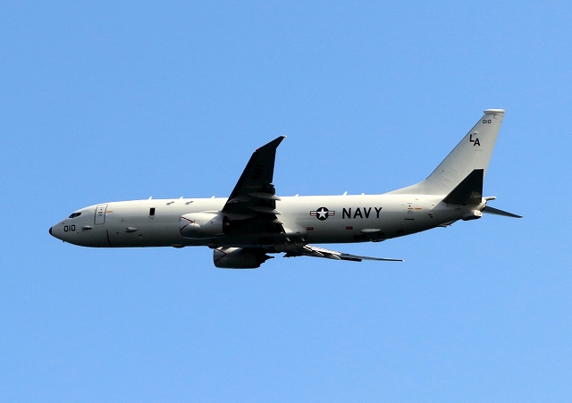 米海軍 P-8A 海上哨戒機 ポセイドン(嘉手納基地、三沢基地)、LA、010番機が飛来、旋回 |