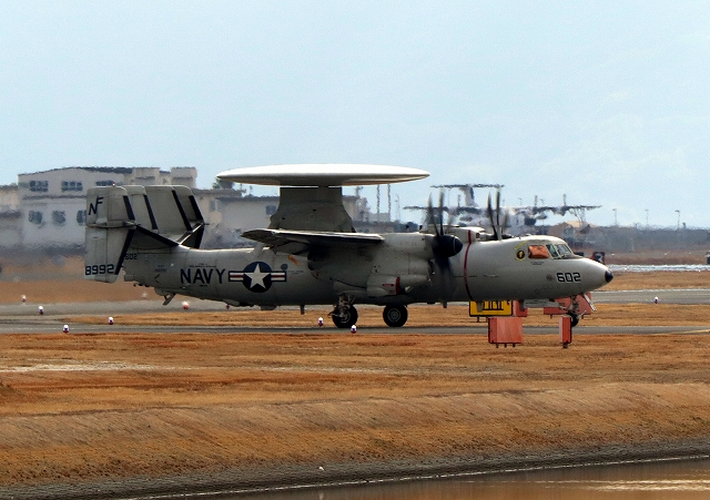 米海軍艦載機 E-2D アドヴァンスド・ホークアイ 早期警戒機(岩国基地)、602番機が着陸 |