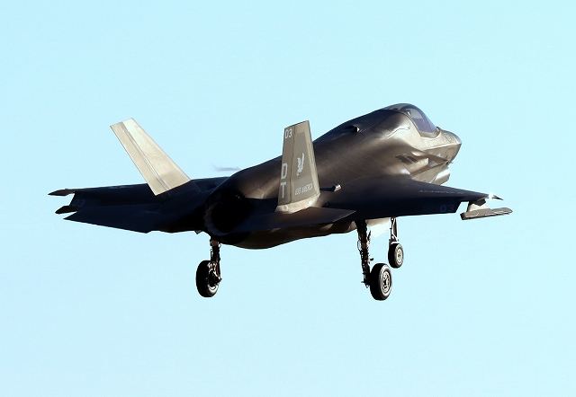 米海兵隊 F-35B ライトニングⅡ 戦闘機(岩国基地)、DT、03番機は旋回 |