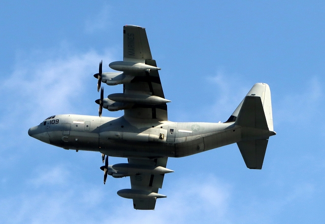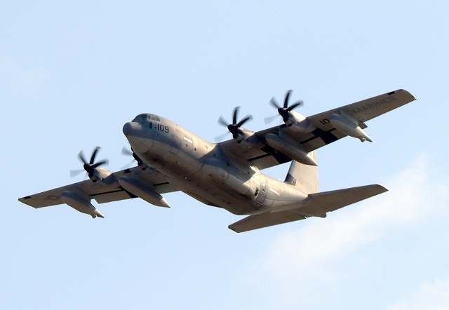 米海兵隊 KC-130J 空中給油機 スーパーハーキュリーズ(岩国基地)、7109番機が離陸 |