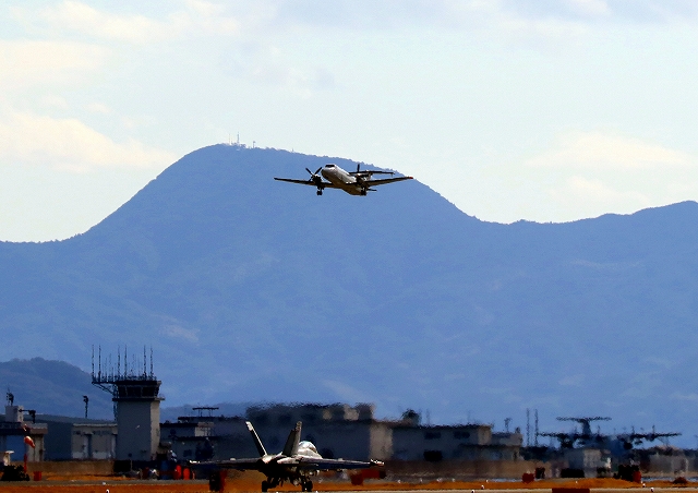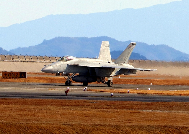 米海軍艦載機 F/A-18E スーパーホーネット 戦闘攻撃機(岩国基地)、NF、306番機が着陸 13時14分に離陸した機。47分間の飛行でした。 |