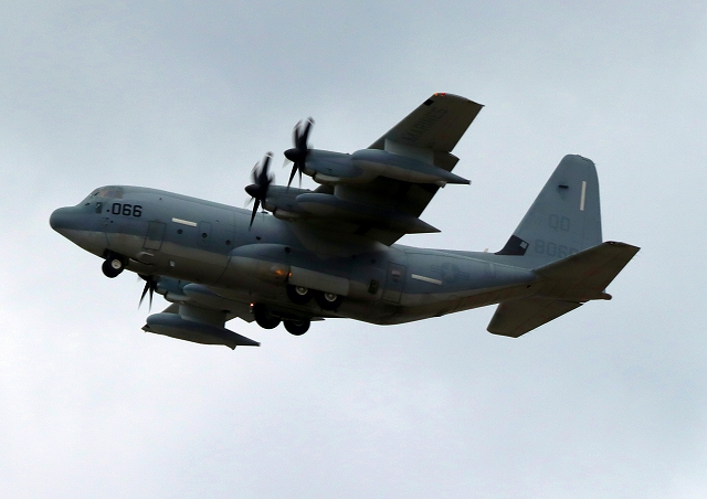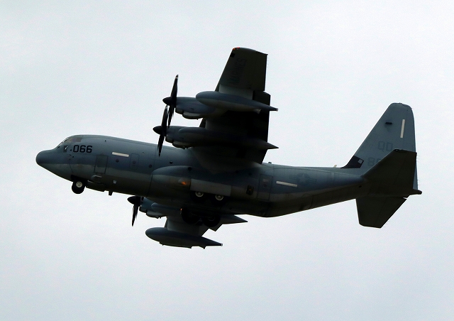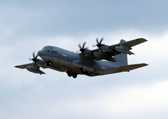 米海兵隊 KC-130J 空中給油機 スーパーハーキュリーズ(岩国基地)、8066番機が離陸 |
