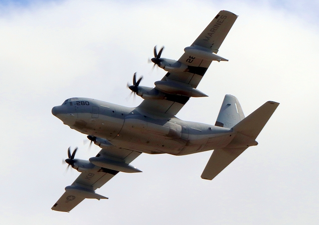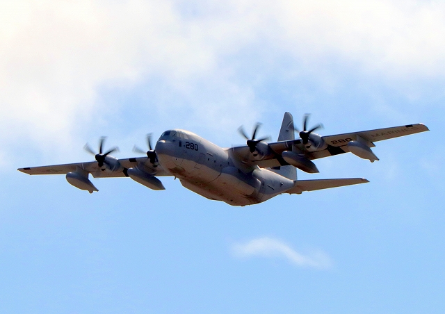 米海兵隊 KC-130J 空中給油機(米本土海兵隊基地所属) スーパーハーキュリーズ、KB 0280番機が旋回(1周目) |